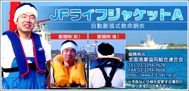 救命胴衣については、現在JFグル−プがブランド商品として推進しているJFライフジャケットを持込、担当者が実際に装着し自動膨張の仕方及び手動の取扱を説明すると共に日常の手入れ法、保険関係についても併せて説明した。また船舶職員及び小型船舶操縦者法施行規則の改正に伴い来年4月1日より「漁船への一人乗り航行・漁ろう中の場合」についてもライフジャケットの着用が義務化されるが、同法改正については、関係資料を配付し啓発した。