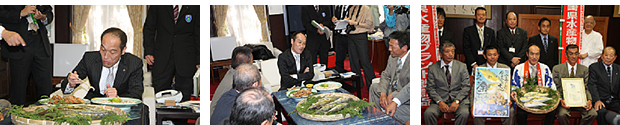 この後、「みやざき金ふぐ振興会」の一行は、県農政水産部長を訪問し、県水産物ブランド品として認証された「みやざき金ふぐ」について、東国原宮崎県知事に報告したことを伝え、今後の支援協力について要望されました。